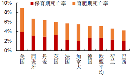 英國豬出欄時的平均瘦肉率最高,為61.4%;美國豬的瘦肉率最低,為55.5%;我國主要飼養杜長大三元豬,本地土豬瘦肉比一般只有4-5 成。造肉能力是評價一頭母豬綜合生產性能的一個較為全面的指標,荷蘭豬憑借其綜合實力在年生產豬肉酮體和瘦肉兩項指標上均排名第一;美國在發達國家中排名靠中。保育豬死亡率和育肥豬死亡率最高的都是美國,分別達到3.87%和5.04%,全程(哺乳期除外)死亡率總計8.91%。而巴西在這兩項指標上均為最低,分別為2.00%和2.20%,全程(哺乳期除外)死亡率總計僅為4.20%。