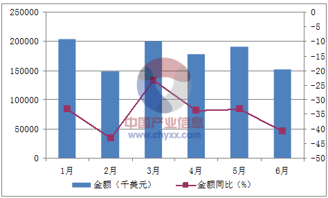 2016年1-6月中國液晶顯示器出口金額統(tǒng)計(jì)圖
