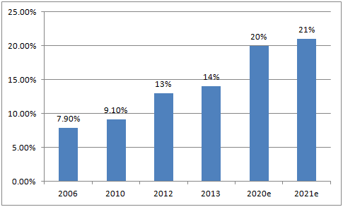 2006-2021年中國在全球數字世界中所占份額及預測(單位:%)