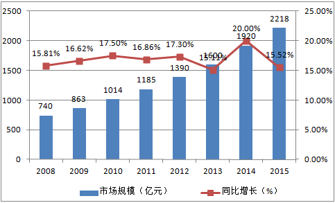 電子政務是中國信息化建設的重要內容,是國家實施政府職能轉變,提高政府管理、公共服務和應急能力的重要舉措,有利于帶動整個國民經濟和社會信息化的發展。在國家的大力支持和推動下,中國電子政務取得了較大進展,市場規模持續擴大。據不完全統計,2015年,電子政務市場規模約為2218億元,同比增長15.52%。
