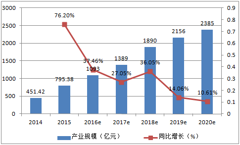 2014年,我國大數據相關硬件市場在451億元,到2015年已經達到795億元的規模。隨著大數據相關產業的快速發展及應用場景的擴大,我國大數據硬件層市場將迎來一個嶄新的快速發展的局面。預計2016年市場規模將達到1093億元,2020年將突破至2385億元。
