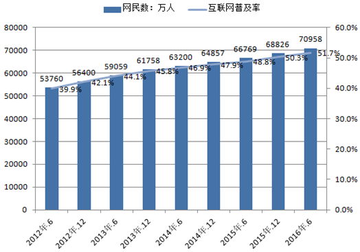 截至2016年6月,我國網民規模達到7.10億,半年共計新增網民2132萬人,半年增長率為3.1%,較2015年下半年增長率有所提升。互聯網普及率為51.7%,較2015年底提升1.3個百分點。