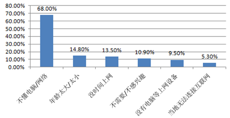 對互聯網知識的缺乏以及認知不足,導致的對互聯網使用需求較弱,仍是造成農村非網民不上網的主要原因。調查顯示,農村非網民不上網的原因主要是“不懂電腦/網絡”,比例為68.0%,其次為“年齡太大/太小”,占比為14.8%,“不需要/不感興趣”占比為10.9%。要解決農村非網民“不會上網”和“不愿上網”的問題,一方面,要發揮鄉鎮村委會、活動中心、學校教育資源的作用,開展農村計算機和網絡知識培訓,推動互聯網知識普及與應用的提升;另一方面,以需求為導向、以地區為維度,推行更符合地域特征、更貼近農民生活的措施及服務,解決農村非網民的上網痛點,引導農村非網民使用互聯網。