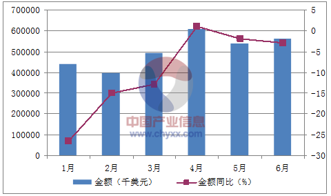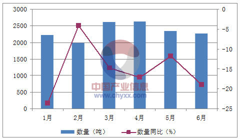 月份數(shù)量(噸)金額(千美元)數(shù)量同比(%)金額同比(%)1月2,227437,578-23.6-26.52月1,978396,880-4.1-14.93月2,605490,374-14.8-12.94月2,626607,895-17.11.15月2,340538,662-11.8-26月2,259561,233-19-2.9數(shù)據(jù)來(lái)源:中國(guó)海關(guān),中經(jīng)先略數(shù)據(jù)中心整理