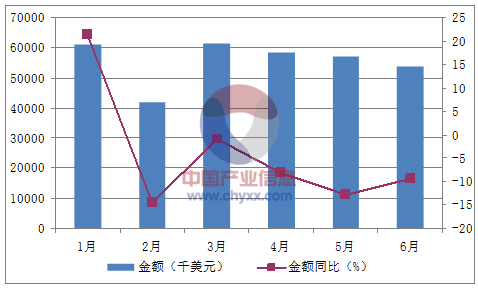 月份金額(千美元)金額同比(%)1月6112521.32月41922-14.43月61419-0.84月58373-8.15月57267-12.86月53848-9.4數據來源:中國海關,中經先略數據中心整理