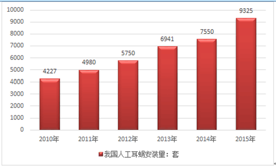 2014年我國國內人工耳蝸安裝量為7550套,2015年國內安裝量在9325套左右,需求較2014年同比增長23.5%。