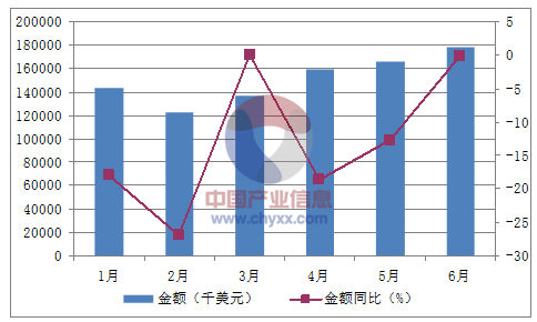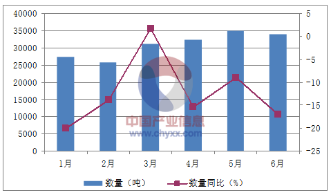 月份數量(噸)金額(千美元)數量同比(%)金額同比(%)1月27,328143,549-20-17.92月25,867122,296-13.9-26.93月31,109137,0351.70.14月32,349159,187-15.4-18.65月34,943166,263-9-12.66月33,971177,868-17.1-0.2數據來源:中國海關,中經先略數據中心整理