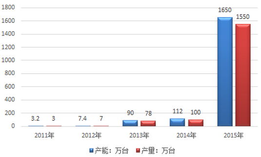 2011-2015年我國(guó)平衡車行業(yè)產(chǎn)能、產(chǎn)量統(tǒng)計(jì)