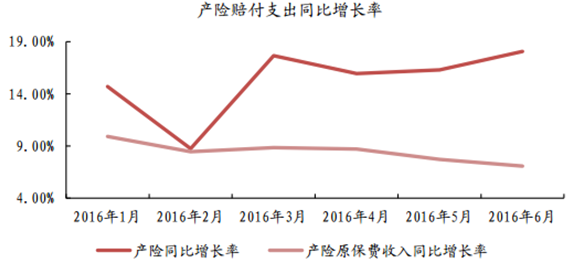 2016 年上半年產險賠付與原保費收入同比增長率