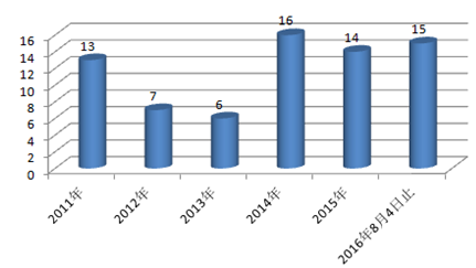 2011-2016年保監會批準籌建保險公司數量(家)