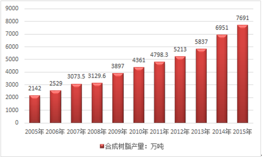 截至2015年數據統計來看,我國合成樹脂及共聚物產量達7691萬噸,同比增長10.5%。