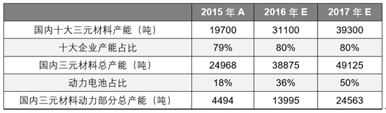 根據對未來三元材料企業發展趨勢的分析,未來國內三元材料龍頭企業產能占比仍能維持 在較高水平,參考 2015 年 79%的產能占比,預計未來前十大企業的產能占比基本維持在 80% 左右,并據此測算出國內三元材料的總產能。而根據高工鋰電資料,2015 年 NCM 中 18%用于動 力電池,EV Tank 則預測到 2017 年動力電池占比能達到 50%左右,預計未來兩年動力 電池在三元材料應用中的占比分別為 36%和 50%,同時測算出 2016 年、2017 三元材料動力部分 的整體產能在 14000 噸和 25000 噸左右。