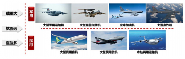 軍用大飛機:除了大型運輸機以外,還包括以大型運輸機為平臺改造的預警機、空中加 油機、轟炸機以及電子戰飛機等。
