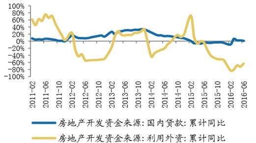 從房地產企業資金來源的占比情況來看,1-6月份,國內貸款占比16.05%,占 比自16年年初以來持續縮小,相對1-5月降低0.61個百分點,利用外資占比0.10%, 仍處歷史低位,自籌資金占比由1-5月的34.73%上升至34.95%,2015年10月以來首 次出現回升;其他資金占比由48.53%上升至48.89%。