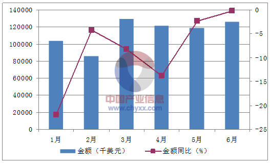 2016年1-6月中國鋼鐵棒材進口金額統(tǒng)計圖