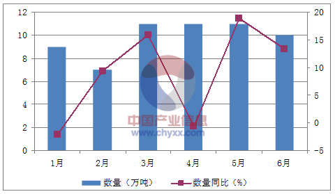 月份數(shù)量(萬噸)金額(千美元)數(shù)量同比(%)金額同比(%)1月9103,769-2.1-21.92月785,6489.4-4.23月11129,64615.9-8.24月11121,726-0.6-13.85月11118,75018.9-2.46月10125,89613.4-0.2數(shù)據(jù)來源:中國海關(guān),中經(jīng)先略數(shù)據(jù)中心整理