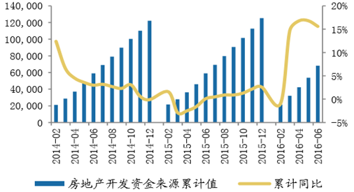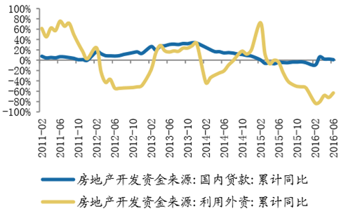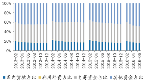 從房地產企業資金來源的占比情況來看,1-6月份,國內貸款占比16.05%,占 比自16年年初以來持續縮小,相對1-5月降低0.61個百分點,利用外資占比0.10%, 仍處歷史低位,自籌資金占比由1-5月的34.73%上升至34.95%,2015年10月以來首 次出現回升;其他資金占比由48.53%上升至48.89%。