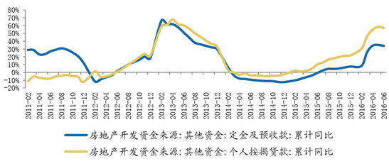 而其他資金方面,1-6月份其他資金同比上漲38.3%,增速較1-5月份收窄1.1個 百分點,其中定金及預收款同比上漲34.1%,個人按揭貸款則同比增長57.0%,增速 環比上月收窄1.5個百分點,為15年3月以來增速首次收窄,從側面反應了需求端的回落。