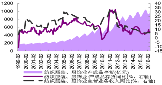 2000~2015 年紡織服裝服飾業(yè)存貨及收入情況