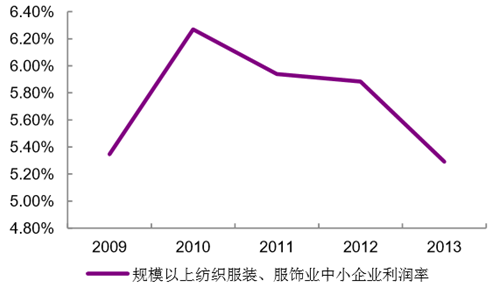 2011年服裝行業(yè)中規(guī)模以上中小企業(yè)家數(shù)出現(xiàn)大幅減少, 當年數(shù)量減幅高達 37.65%,同時 2010 年以來中小企業(yè)利潤率持續(xù)走低,顯 示在行業(yè)進入調整期間、中小企業(yè)受到?jīng)_擊較大。