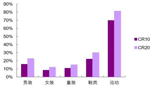 品牌服飾各子行業(yè)集中度較低