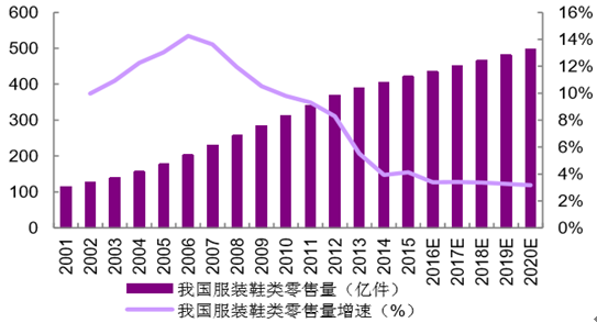 我國整體服裝類產(chǎn)品消費量不斷增長