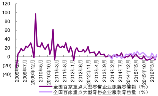 全國百家零售企業(yè)服裝類單月零售增速波動較大