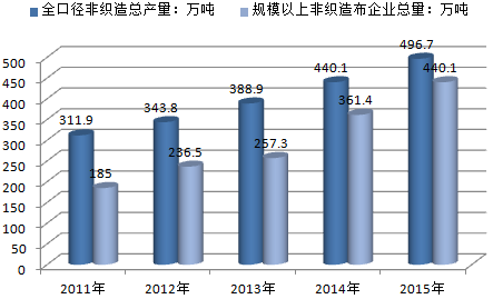 2014年,全國針刺非織造布總產量101.22萬噸,同比增長12.3%;2015年,全國針刺非織造布總產量約115.41萬噸。2011-2015年全國針刺非織造布總產量