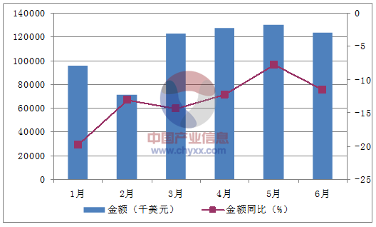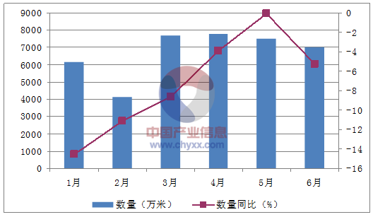 月份數量(萬米)金額(千美元)數量同比(%)金額同比(%)1月6,16795,557-14.6-19.82月4,15571,574-11.1-13.13月7,716123,070-8.6-14.44月7,771127,717-3.9-12.35月7,528129,819-0.1-7.86月7,014123,388-5.3-11.5數據來源:中國海關,中經先略數據中心整理