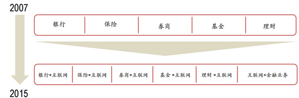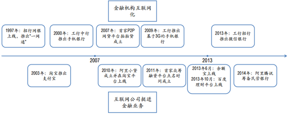 2013 年被認為是“互聯(lián)網(wǎng)金融元年”,隨著余額寶上線,劃時代的門戶理財 方式到來,之后百度、網(wǎng)易紛紛上線理財平臺,2014 年,阿里和騰訊更開始 籌備民營銀行。從這個時點起,包括第三方支付、網(wǎng)貸、眾籌和門戶理財?shù)?主流互聯(lián)網(wǎng)金融模式已完全確立和全面爆發(fā)。與此同時,傳統(tǒng)金融機構也不 單止步于“將業(yè)務呈現(xiàn)在網(wǎng)上”和“將業(yè)務遷移到手機上”,開始真正以互 聯(lián)網(wǎng)為依托,對業(yè)務模式進行大刀闊斧地改造,包括網(wǎng)絡銀行和保險在內(nèi)的 一系列新型平臺上線。應對市場的迅猛變換,監(jiān)管也加速加強了對互聯(lián)網(wǎng)金融的規(guī)范。