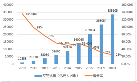 2016-2018年中國第三方互聯(lián)網(wǎng)在線支付市場交易規(guī)模預測