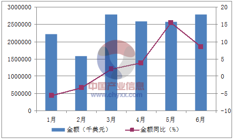 月份金額(千美元)金額同比(%)1月2218460-5.62月1591930-3.43月278338724月25828113.85月258116115.56月27830018.5數據來源:中國海關,中經先略數據中心整理