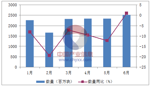 月份數量(百萬塊)金額(千美元)數量同比(%)金額同比(%)1月2,268966,700-8-20.32月1,660737,598-19.4-17.83月2,3291,076,638-7.2-5.94月2,3391,029,746-9.5-9.95月2,3431,056,090-12.3-7.56月2,5131,150,6840.9-7.6數據來源:中國海關,中經先略數據中心整理