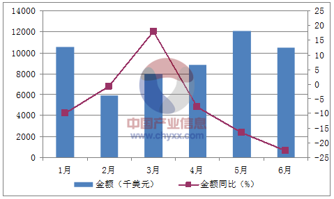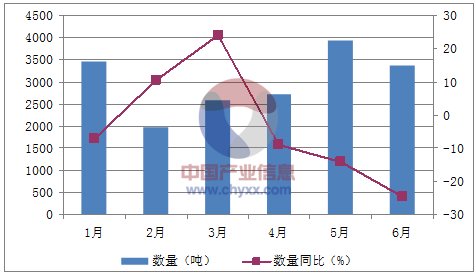 月份數量(噸)金額(千美元)數量同比(%)金額同比(%)1月3,47410,551-7.1-9.92月1,9895,96310.5-0.83月2,5778,02024.1184月2,7148,845-9.1-7.75月3,94412,073-14.2-16.46月3,37710,490-24.6-22.7數據來源:中國海關,中經先略數據中心整理