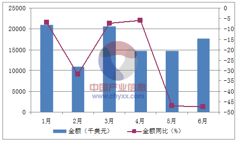 月份數量(噸)金額(千美元)數量同比(%)金額同比(%)1月97521,034-17-6.82月53811,022-38.5-31.83月69420,6293.6-7.24月88814,7555.8-65月94014,779-3.5-46.96月93417,729-12.7-47.5數據來源:中國海關,中經先略數據中心整理