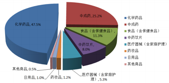 據中國醫藥商業協會典型樣本城市零售藥店2015年品類銷售統計,零售藥店銷售額中的藥品類占主導地位,占零售總額的80.7%,其中化學藥品占47.5%、中成藥占25.2%、中藥飲片占8.0%;非藥品銷售占19.3%,其中食品(含保健食品)占11.3%,而藥妝品、日用品和其他商品這三類總占比不足3%。