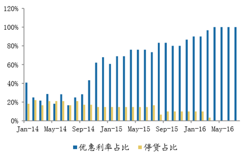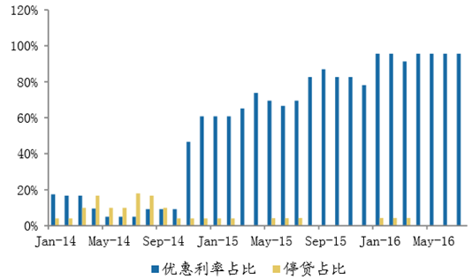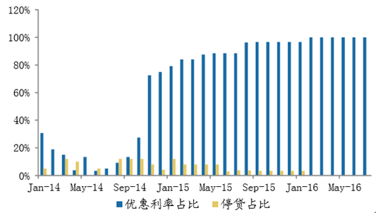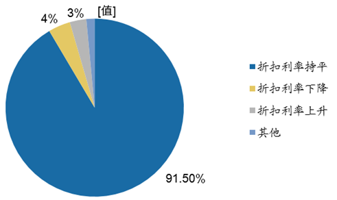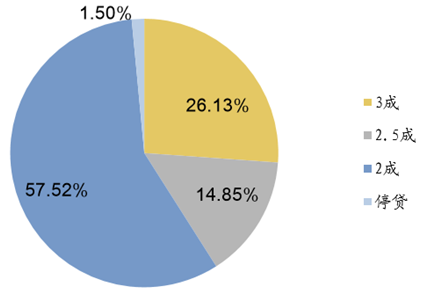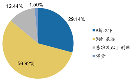 從具體的利率分布來看,在532家銀行中提供優惠利率的銀行有 458家,環比上月增加了4家,占比86.06%,較上月增加0.75個百分點,再創歷史新 高。其中有155家銀行提供9折以下優惠利率,環比上月微增2家,占比29.14%。而 在提供9折以下優惠利率的銀行中,提供8.5折優惠利率的銀行數量環比上月增加了3 家,達到了125家。此外,提供9折優惠的銀行有212家,環比上月微增1家,占比 39.85%。