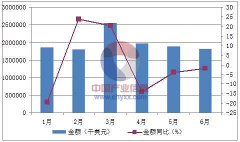 月份數量(萬噸)金額(千美元)數量同比(%)金額同比(%)1月391,854,7127.2-19.62月391,791,86257.323.73月532,547,4034920.54月401,972,1826.3-14.25月381,881,73720.1-3.96月381,805,60325-1.8數據來源:中國海關,中經先略數據中心整理