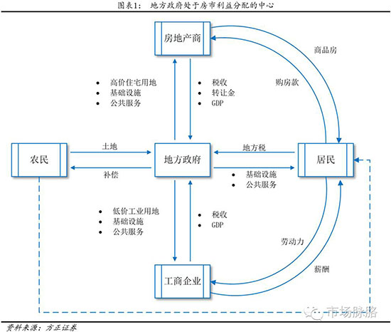 地方政府處于房市利益分配的中心,其行為對土地市場、房地產(chǎn)市場、產(chǎn)業(yè)結(jié)構(gòu)、經(jīng)濟增長、社會福利等都產(chǎn)生了重要甚至是決定性的影響。以地方政府為中心,農(nóng)民、居民、房地產(chǎn)(開發(fā))商、工商企業(yè)、地方政府進行著博弈。