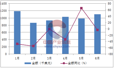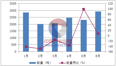 月份數量(噸)金額(千美元)數量同比(%)金額同比(%)1月2,8611,191-41.8-482月2,019863-49-54.83月2,060931-15.7-0.94月2,4591,027-36.2-34.35月2,30398398.564.66月2,9241,1016.4-3.9數據來源:中國海關,中經先略數據中心整理