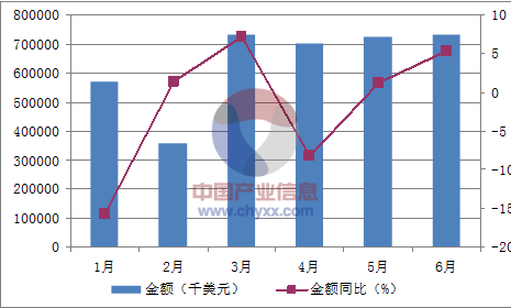 2016年1-6月中國鋸材進(jìn)口金額統(tǒng)計(jì)圖