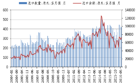 2004-2016年進口原木數量和金額