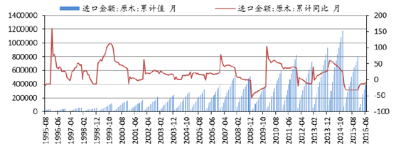 1995-2016年進口原木金額及同比:累計值