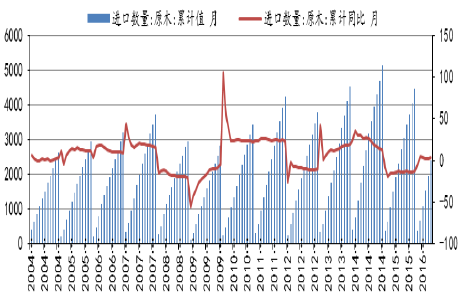 2004-2016年進口原木數量及同比