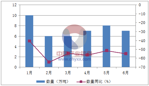 核心提示:智研咨詢數(shù)據(jù)顯示:2016年1-6月中國(guó)棉花進(jìn)口數(shù)量為43萬(wàn)噸,同比下降53.8%;2016年1-6月中國(guó)棉花進(jìn)口金額為729,998千美元,同比下降54.9%。2016年1-6月中國(guó)棉花進(jìn)口量統(tǒng)計(jì)表如下表所示: 2016年1-6月中國(guó)棉中經(jīng)先略數(shù)據(jù)中心數(shù)據(jù)顯示:2016年1-6月中國(guó)棉花進(jìn)口數(shù)量為43萬(wàn)噸,同比下降53.8%;2016年1-6月中國(guó)棉花進(jìn)口金額為729,998千美元,同比下降54.9%。2016年1-6月中國(guó)棉花進(jìn)口量統(tǒng)計(jì)表如下表所示:2016年1-6月中國(guó)棉花進(jìn)口量統(tǒng)計(jì)表月份數(shù)量(萬(wàn)噸)金額(千美元)數(shù)量同比(%)金額同比(%)1月10158,513-40.7-41.32月699,247-64.6-63.23月6101,944-54.7-53.94月7116,079-56.4-58.65月8130,011-51.6-54.36月7124,247-55-57.4數(shù)據(jù)來(lái)源:中國(guó)海關(guān),中經(jīng)先略數(shù)據(jù)中心整理2016年1-6月中國(guó)棉花進(jìn)口數(shù)量統(tǒng)計(jì)圖