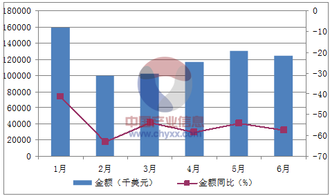 資料來(lái)源:中國(guó)海關(guān),中經(jīng)先略數(shù)據(jù)中心整理2016年1-6月中國(guó)棉花進(jìn)口金額統(tǒng)計(jì)圖