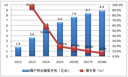 2016-2018年中國國產移動智能終端保有量預測