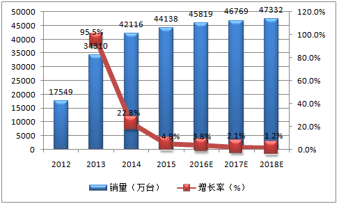 2016-2018年中國智能手機銷量預測