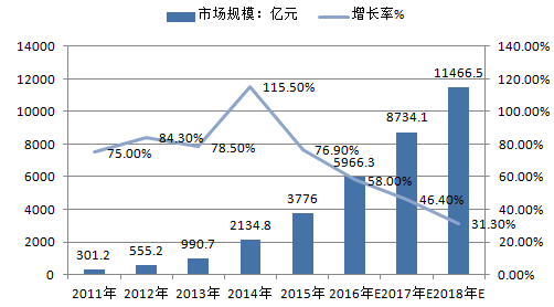 2014年中國移動互聯網市場規模達到2134.8億元人民幣,同比增長115.5%,同時未來依舊會保持高速增長,預計到2018年整體移動互聯網市場規模將突破1萬億大關。