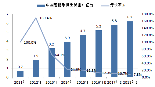 2014年中國智能手機出貨量達到3.9億臺,同比增長21.9%,未來仍會保持平穩增長。